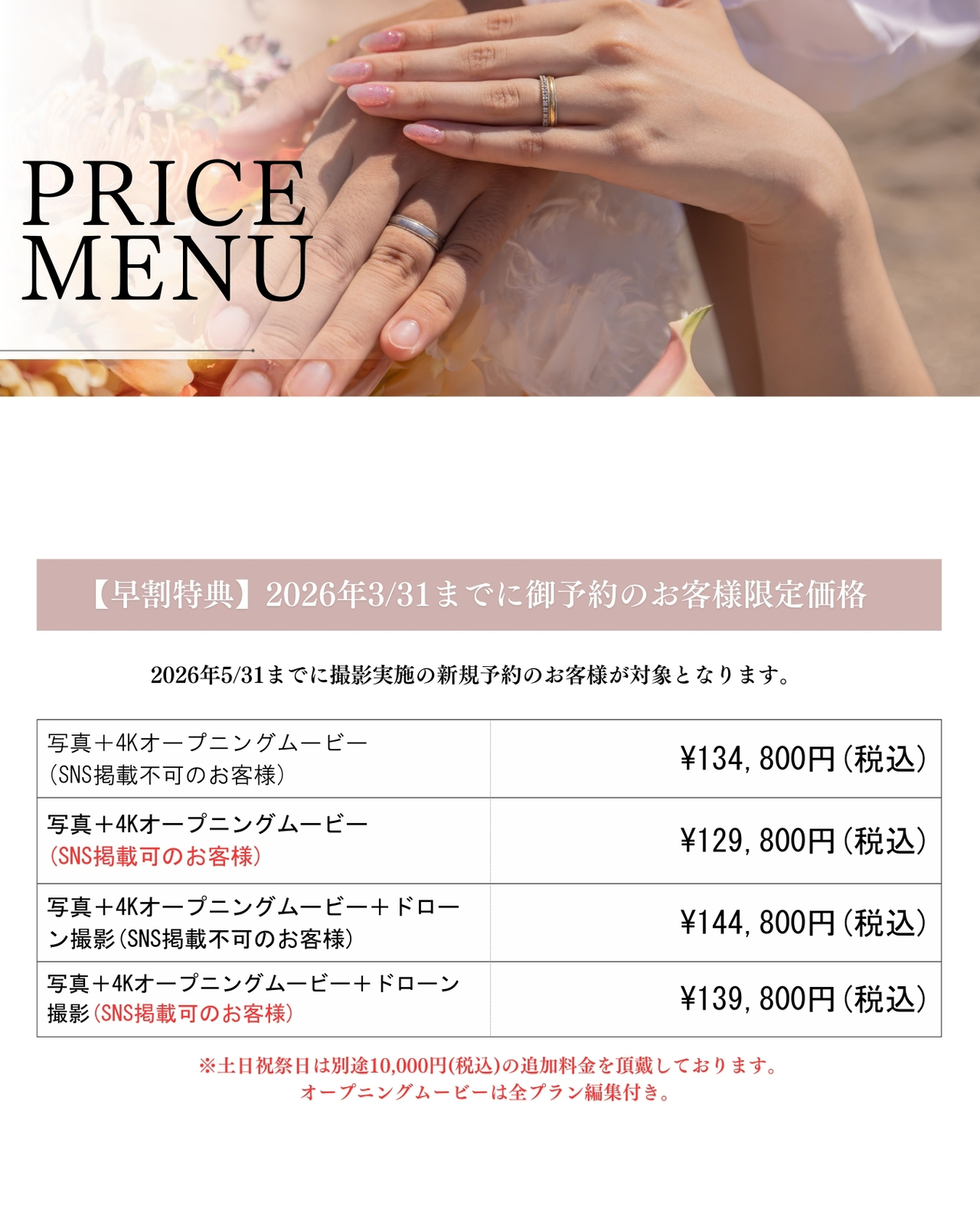 | 写真+4K映像オープニングムービー(編集付) | 189,800円(税込)→149,800円(税込) ※土日祝祭日は別途+10,000円(税込) 上記金額よりSNS掲載OKの方は5000円割引 【早割特典】2026年3/31までに撮影予約のお客様は 更に15000円割引致します。 |